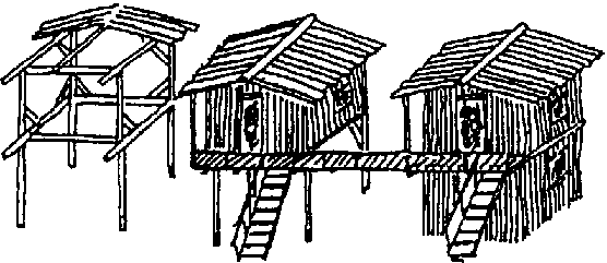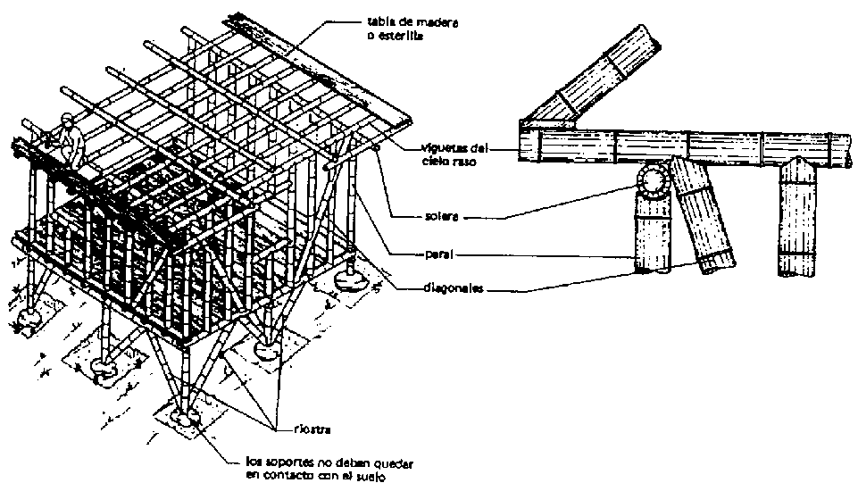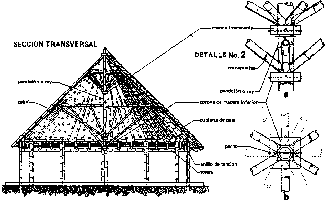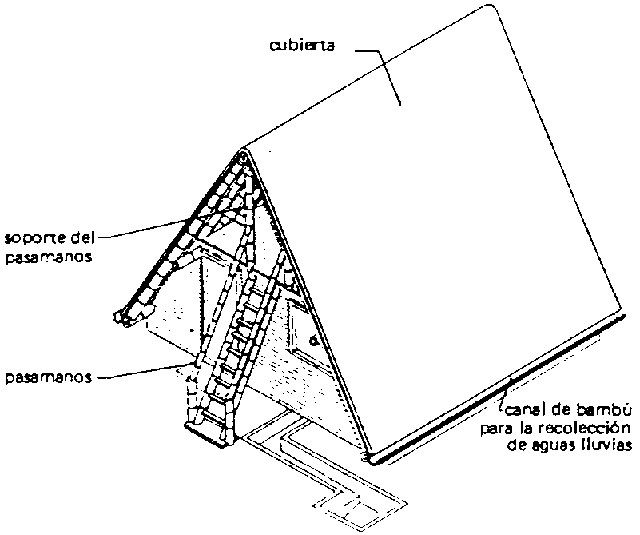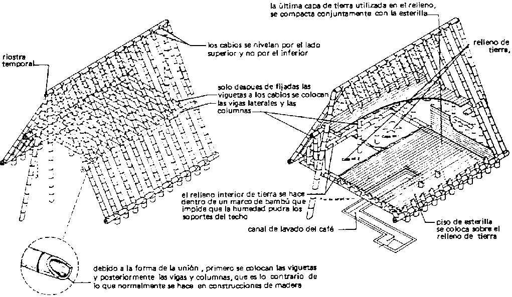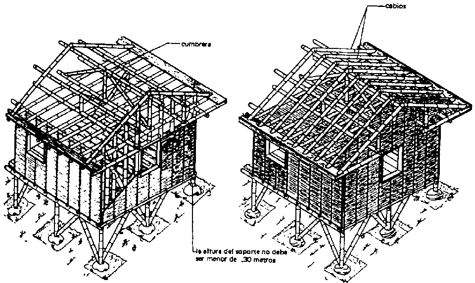 Los ejemplos de casas de bambú mostradas en las siguientes paginas son tomados del manual de construcción magníficamente ilustrado por Oscar Hidalgo López (Bibl. 24.07).