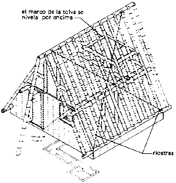 Colocación de los cabios y construcción del piso y entrepiso (piso y paredes con estera de bambú o listones de madera, entrepiso cubierto con tierra compactada estabilizada).
