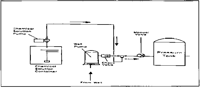 Water-based solutions of either the liquid or the dry form of hypochlorite are prepared in predetermined stock solution strengths. Solutions are injected into the water supply using special chemical metering pumps called hypochlorinators. Positive displacement types are the most accurate and reliable and are commonly preferred to hypochlorinators employing other feed principles (usually based on suction). Positive-displacement-type hypochlorinators are readily available at relatively modest costs. These small chemical-feed pumps are designed to pump (inject under pressure) an aqueous solution of chlorine into the water system. They are designed to operate against pressures as high as 100 psi, but may also be used to inject chlorine solutions under ambient (atmospheric) or negative head conditions. Hypochlorinators come in various capacities ranging from 3.8 to 227 I/day. Usually, the pumping rate is manually adjusted by varying the stroke of the pump's piston or diaphragm. Once the stroke is set, the hypochlorinator accurately feeds chlorine into the system at that rate, maintaining a constant dose. This works well if the water supply rate and the output of the pump are fairly constant.