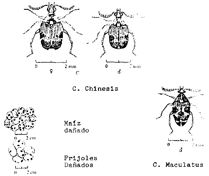 El gorgojo común del frijol (Acanthoscelides obtectus) y el gorgojo pintado (Zabrotes subfasciatus) son gorgojos de 2.5 mm de longitud sin hocicos y son las plagas principales de los frijoles almacenados. A. obtecus (el gorgojo común) predomina en las áreas más frescas, mientras Z. subfasciatus (el gorgojo pintado) prefiere las regiones más calientes. Los ciclos de vida de los dos tipos son muy similares, comenzando con la oviposición de los huevos entre las semillas almacenadas o dentro de rajaduras de las vainas en el campo. Las larvas horandan túneles dentro de la semilla para alimentarse. La etapa adulta del gorgojo es corta, y los adultos no se alimentan mucho. Los dos tipos de gorgojos pueden estar presentes al principio, pero A. obtectus es el mejor competidor en las temperaturas más bajas y predomina bajo esas condiciones. Se calcula que estos gorgojos ocasionan pérdidas de granos almacenados hasta el 35 por ciento en México y América Central.