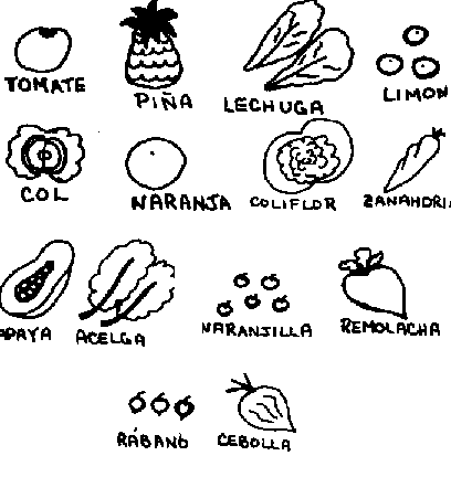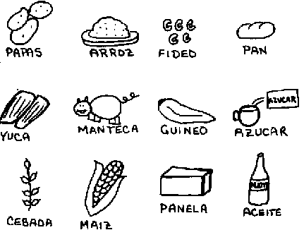 Uno de los juegos que más les gusta a los niños es el Bingo. Se necesitan unas tarjetas - una para cada estudiante - con 16 cuadros. En un cuadro se escribe "GRATIS " y en los otros 15, se dibuja un alimento. A continuación, un ejemplo. Cada tarjeta tiene que ser diferente y tener ejemplos de alimentos de los tres grupos. Como es bastante trabajo hacer las tarjetas, los niños mismos pueden hacerlo. Déles una lista de todas las comidas posibles (vea la ilustración en la próxima página). Ellos pueden dibujar unos 15 alimentos (o solamente escribir el nombre de los alimentos) para llenar su tarjeta. Para este juego, también se necesita algo que los niños puedan usar para marcar sus tarjetas - como fréjoles o habas - .