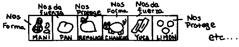 Una casa también necesita energía, ¿ no? Tenemos un foco o una esperma para darnos luz. Un fuego da calor y energía para cocinar. Así mismo, nuestros cuerpos necesitan energía. Hay un grupo de alimentos que sirve específicamente para darnos energía - como el fuego y la luz da energía a la casa. Estos son "los alimentos que nos dan fuerza " (Ahora haga una lista de los alimentos en este grupo)