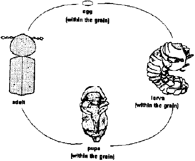 3). The eggs hatch into larvae, larvae into pupae and pupae into adult beetles (see diagram below).