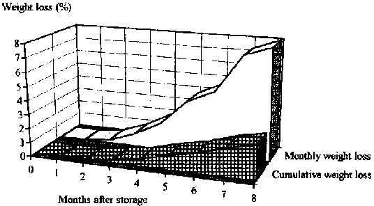 The data were analysed using SAS computer programs. Means of weight losses assessed with different methods were compared with a 2-tailed t-test (Dunnett) and for a confidence level of 95%. Data input and analysis for the questionnaires were done with the "Epi Info Version 5", a word processing, database and statistical system for epidemiology, on microcomputers provided by the GTZ Health Project in Tamale.