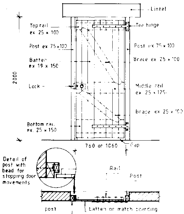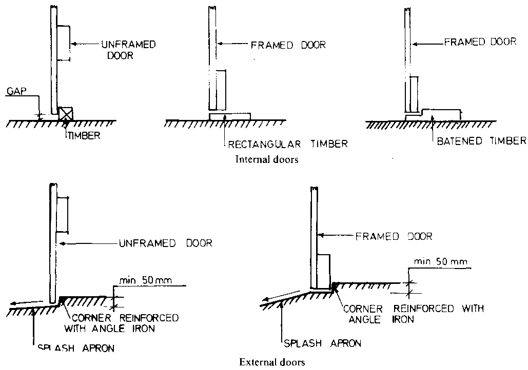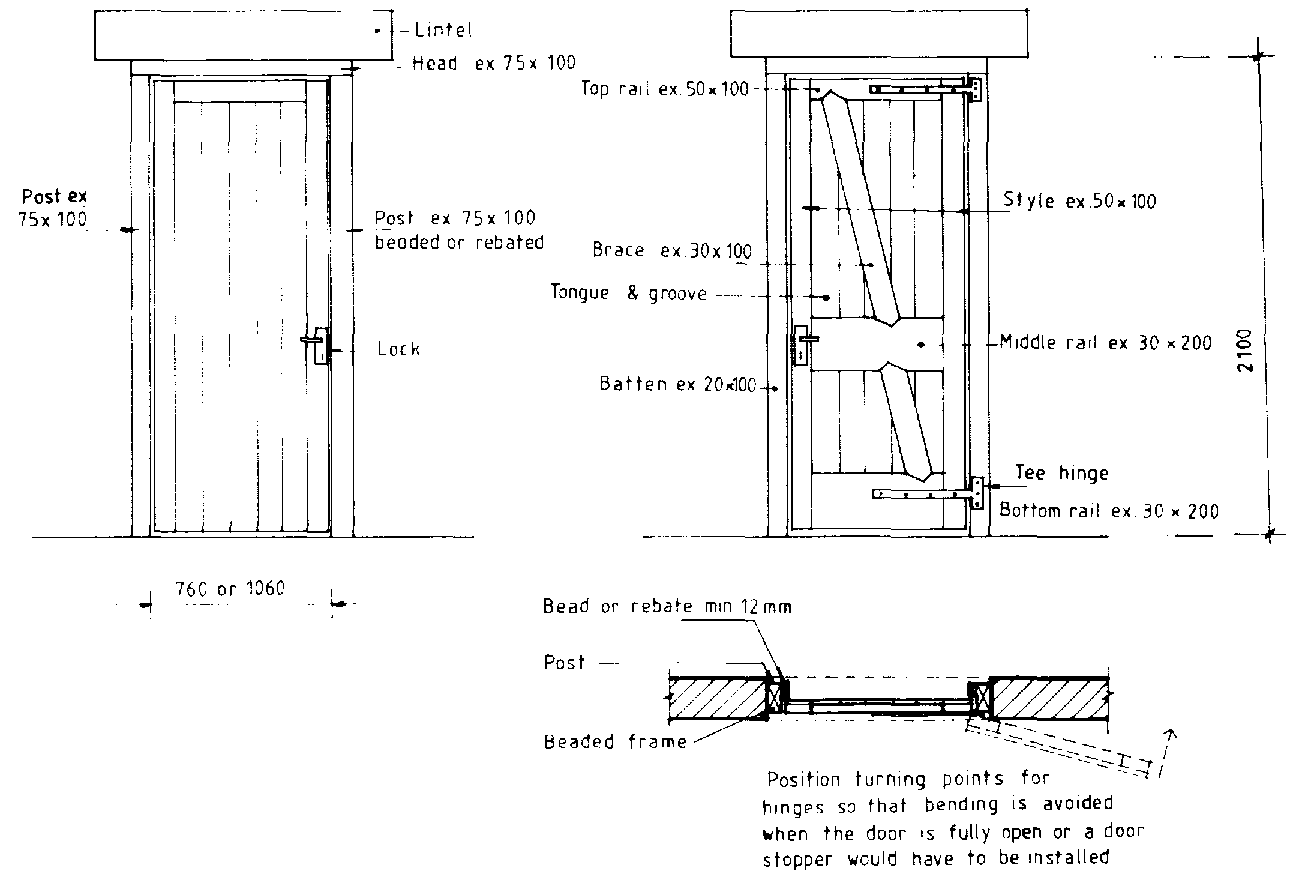 Size: Doors must be of adequate size. For use by people only, a door 70cm wide and 200cm high is adequate. However, if a person will be carrying loads with both hands, e.g. 2 buckets, 100 to 150cm of width will be required. If head loads will be carried, door heights may need to be increased to 250cm. Shop or barn doors need to be considerably larger to give access for tools and machinery.