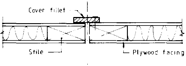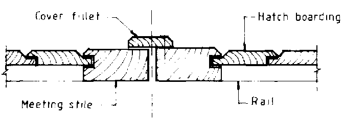Double Doors: Large door openings are often better served by double doors. If hinged doors are used, the smaller double doors are not as likely to sag and bend and they are much less likely to be affected by wind. Usually opening one of the double doors will allow a person to pass through. Figure 5.70 shows how the meeting point of the two doors can be covered and sealed with a cover fillet.