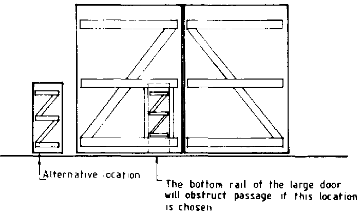 When doors are large and heavy and need to be opened only occasionally, it is desirable to place a small door either within or next to the large door. Figure 5.71 shows typical locations for a small door for the passage of people.