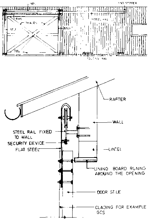 In all cases it is desirable to have guides at the base to prevent wind interference and to make the building more secure from intruders. For security reasons the door hangers should be of a design that cannot be unhooked but only roll on or off the end of the track. The most secure place to mount the door hangers is on the stiles (end frame pieces). See Figure 5.72 for details.