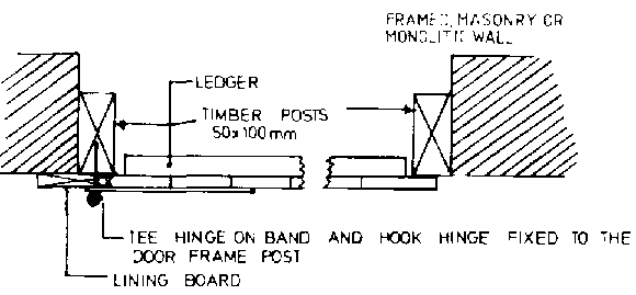 A timber door frame consists of two side posts or jambs, a sill or threshold, and a head or soffit. For simple buildings not requiring tight-fitting doors, the two jambs as shown in Figure 5.73 may be all that are necessary. However, if a tightly fitting door is desired, then a complete frame is required including strips or stops around the sides and top against which the door closes. In as much as the door jambs are installed against the wall, and the fit may not be precise, dwelling house doors are often hung in an inner frame that can be plumbed and levelled by inserting shims between the inner and outer frames as shown in Figure 5.74.