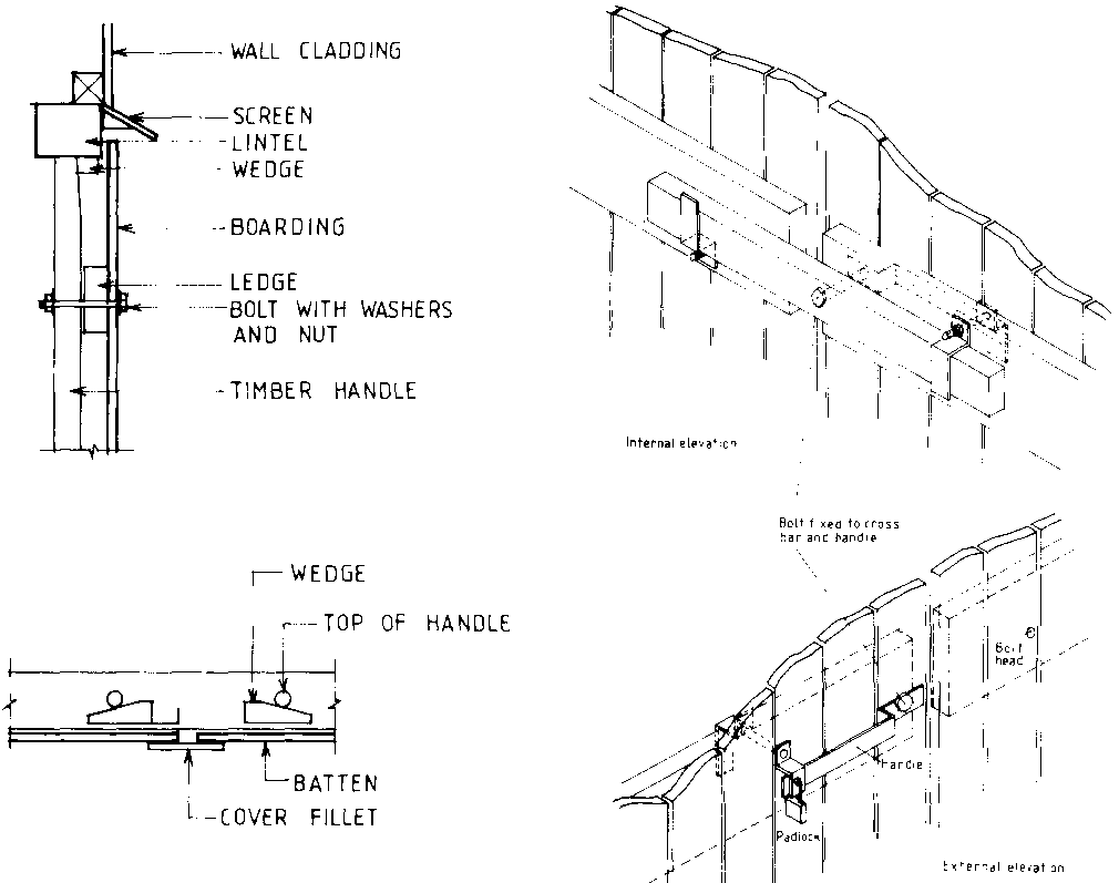 Large double doors are normally secured by locking them both at the top and the bottom. Thus four sliding bolt locks are required and should be installed close to where the doors meet. In small double doors top and bottom locks are only required for one of the doors. Figure 5.77a illustrates a simple wooden handle locking with a wedge nailing to the lintel. It can be used at the top of an unframed door. Note that the top rail must be placed down far enough to allow movement of the top of the handle. In, for example barn doors, where movements of the door can be tolerated, often only a lock at the top is provided.