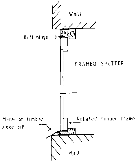 Shutters: These are basically small doors and are constructed as unframed, framed or flush shutters. Because of the smaller size only two rails are required and the timber can be of smaller dimension. The principles of construction are the same as for doors. However, when the frame for the shutter is recessed in the wall, the sill must be sloped and extend out from the wall to let the water drip clear of the face of the building. The window shutter can be sidehinged or top-hinged. A top-hinged shutter has the advantage of shading the opening when kept open as weld as allowing ventilation while preventing rain from entering.
