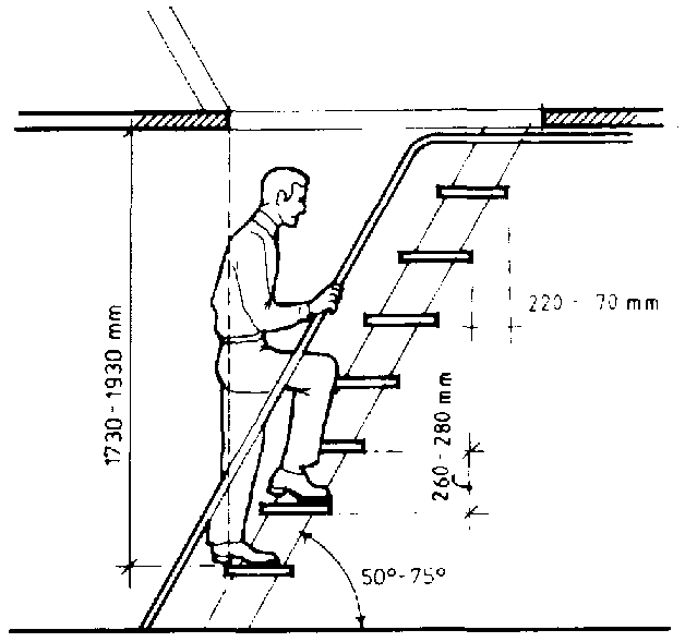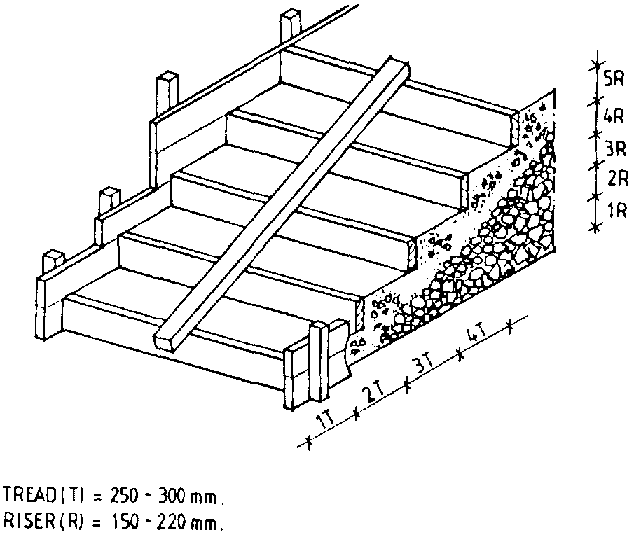 The angle, as determined by height and the horizontal distance available, will determine the most suitable means of getting from one level to another. For a slope up to 1:8 (7°). A ramp is suitable for both walking and pushing a wheelbarrow. For walking alone, a 1:4 ( 14° ) slope is satisfactory if it remains permanently dry. For slopes between 1:3 and 1:0.8 (18 to 50°), stairways are possible, although 30 to 35° is preferred. Angles steeper than 50° require a ladder or ladder-stairway. Temporary ladders should be set up at 60 to 75°, while a fixed ladder may be vertical if necessary.