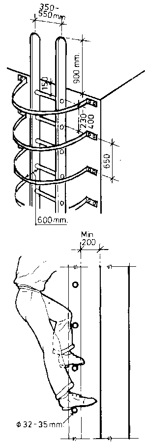 Ladders which are moved from place to place should have hooks and dowels so that they can be thoroughly stabilized at the bottom and top. Ladders mounted permanently should be firmly secured in their position, and if necessary, provided with handrails. If the total length is more than 5 metres and the pitch steeper than 70°, the ladder should be provided with a guard preventing the climber from falling backward. If the ladder is taller than 2.5 metres and starts from a small platform, it too should have a guard.
