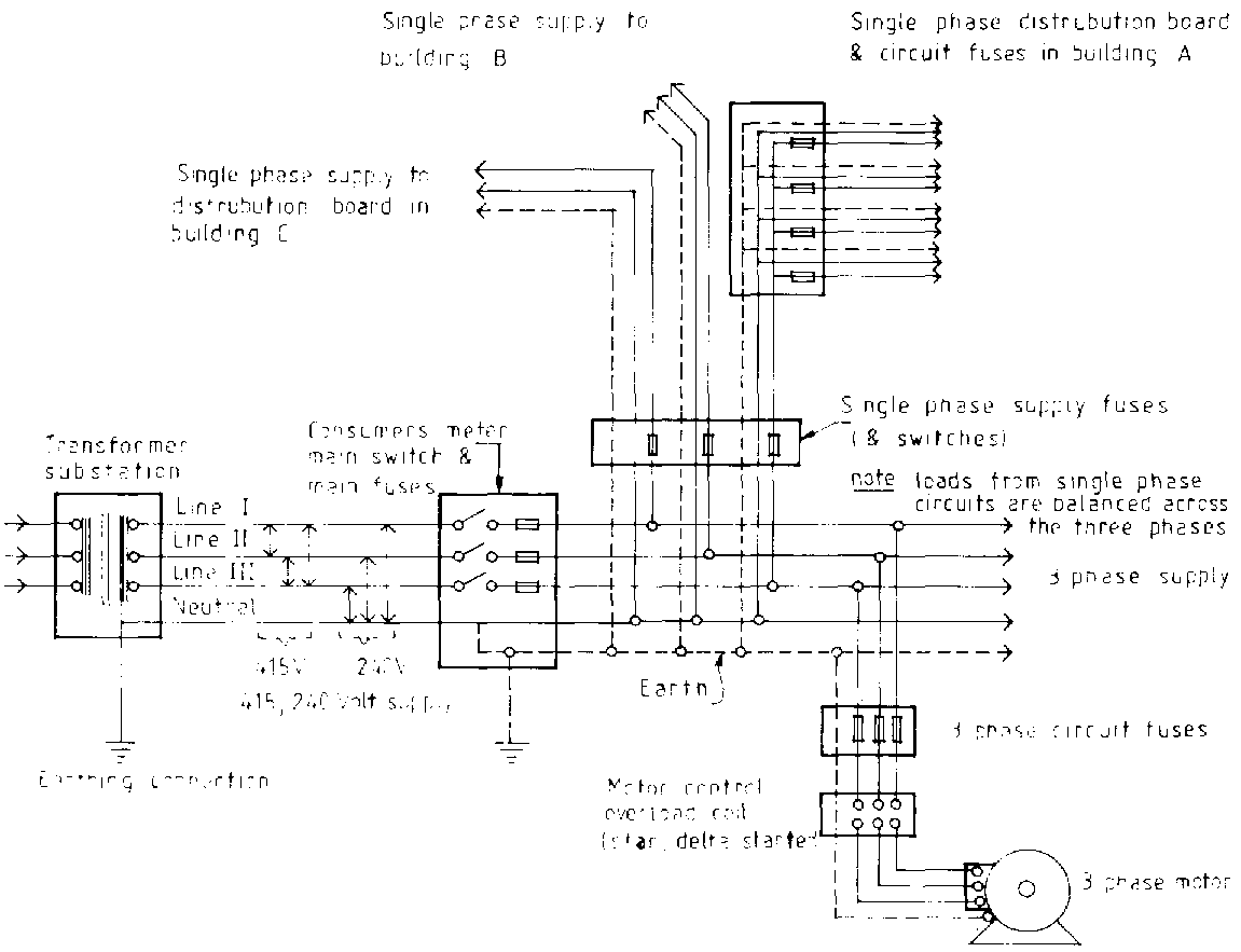 Electricity supply to a farm will normally reach it overhead from a local transformer substation where the voltage has been redued to a three-phase, 415/ 240V supply. Four wires are required for a three-phase supply, one for each of the lines and one common return or neutral. The neutral is connected to earth at the substation. The voltage between any phase wire and the neutral is 240V, while it is 415V between any two phase wires. If nearly equal loads are connected to each of the phases, the current in the neutral will be kept to a minimum. To achieve this most appliances that consume large amounts of electricity, notably electrical motors and larger heater and air-conditioning units are designed for connection to a three-phase supply. Lighting circuits, socket outlet circuits and appliances of low power rating are served with single-phase supply, but the various circuits are connected to different phases to balance the overall loading. However, sometimes small farms or domestic houses are served with a single-phase, 240V supply. In this case only two wires are required in the supply cable, one live and one neutral. The balancing of loading is effected at the substation, where the lines from several houses are brought together.