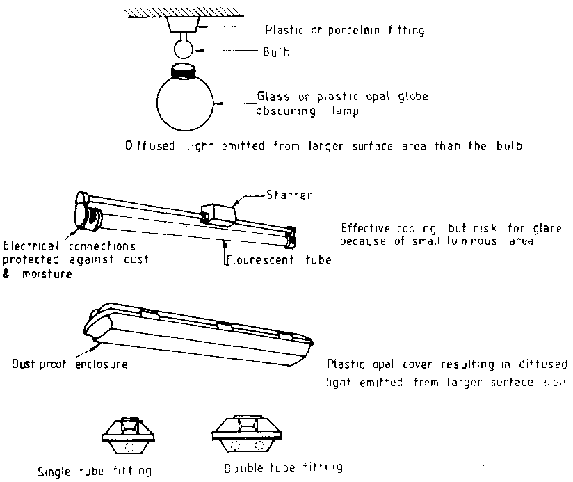 Various types of fittings are normally available for both bulbs and tubes. While a naked bulb or tube may be sufficient in some circumstances, fittings that protect the lamp from physical damage and moisture penetration will often be required in farm buildings. From an optical point of view the fitting should obscure the lamp and present a larger surface area of lower brightness to reduce the glare caused by excessive luminance contrast. This is particularly important if the lamp is positioned where it will be directly viewed. A lighting point must also be positioned so that reflected glare and trouble some shading of a work area is avoided. While light colours on interior surfaces will create a bright room, shades of blue or green produce a feeling of coolness. The dusty conditions in many farm buildings implies the use of fittings that allow for easy cleaning. Accumulated dust can reduce the flow of light by more than 50%.