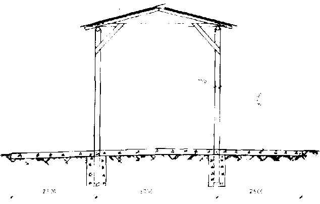 With these needs in mind a shade structure allowing 2.5 to 3m: per animal will give the minimum desirable protection for cattle, whether it be for one animal belonging to a small holder or many animals in a commercial herd. A 3x7m roof will provide adequate shade for up to X cows. The roof should be a minimum of 3m high to allow air movement. If financially feasible, all the area that will be shaded some time during the day should be paved with good quality concrete. The size of this paved area depends on the orientation of the shade structure. If the longitudinal axis is east and west, pan of the floor under the roof will be in shade all day. Extending the floor approximately one third its length on the east and on the west as shown in Figure 10. 3, a paved surface will provide for the shaded area at all times.