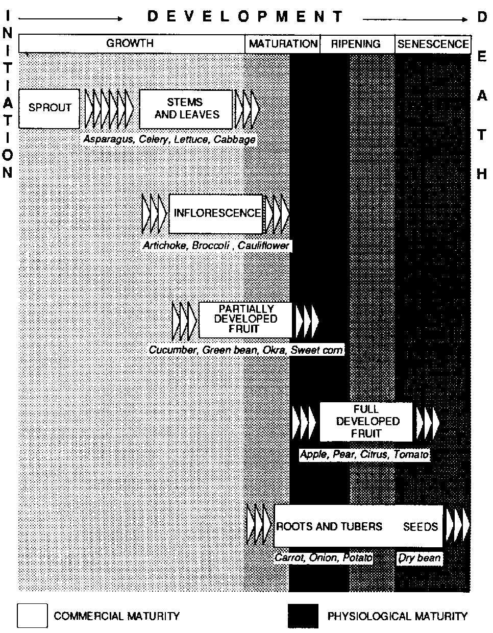 A critical time for growers of fruit and vegetables is the period of decision on when to harvest a crop. Normally any type of fresh produce is ready for harvest when it has developed to the ideal condition for consumption. This condition is usually referred to as harvest maturity. Confusion may arise because of the word maturity since, in the botanical sense, this refers to the time when the plant has completed its active growth (vegetative growth) and arrived at the stage of flowering and seed production (physiological maturity) as shown in Figure 3.1. Harvest maturity thus refers to the time when the "fruit" is ready to harvest and must take into account the time required to reach market and how it will be managed en route. This time lag usually means that it is harvested earlier than its ideal maturity.