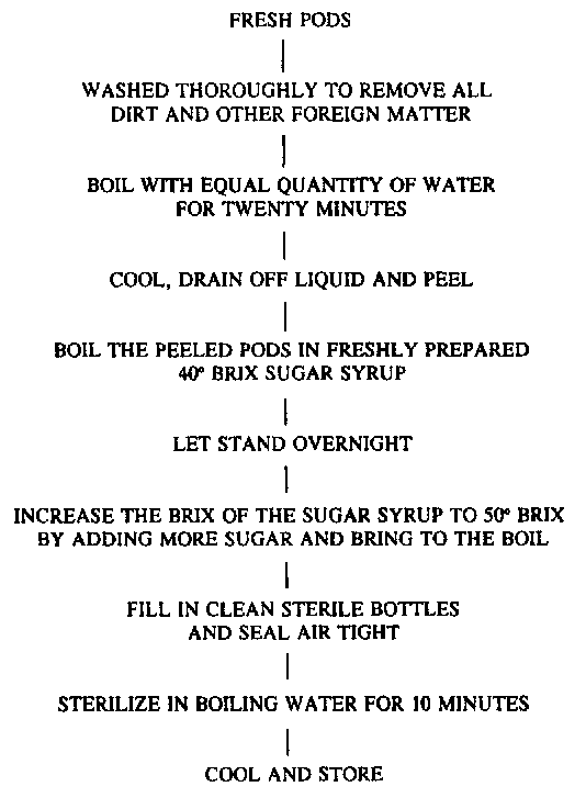 The process involves softening of the pods (ripe) by boiling in water. The soft pods are cooled and peeled using stainless steel knives, then processed in sugar syrup of desired strength and bottled. The bottled pods are further sterilized in boiling water and cooled.
