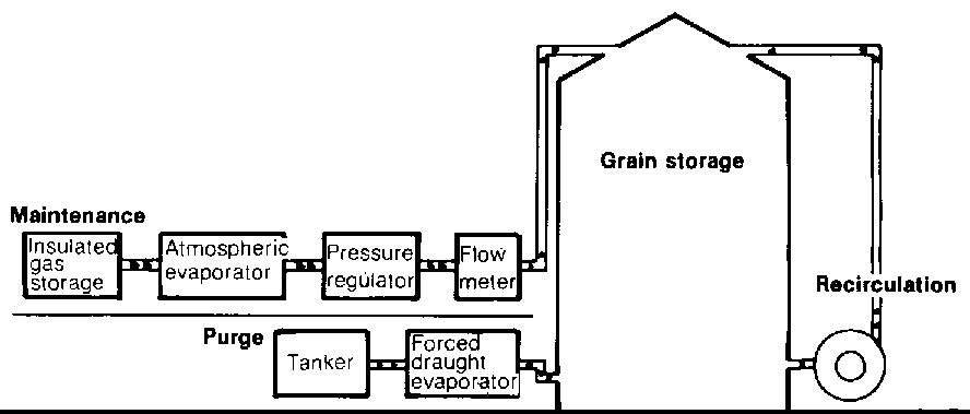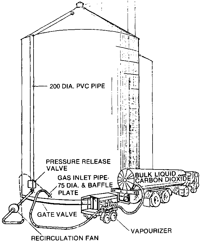 The application technique and introduction of CO2 into the structure is similar as for liquid nitrogen but after the initial purge, it has been demonstrated that there is a need for gas recirculation in order to avoid regions of inadequate CO2 concentration in the upper parts of the storage (Wilson, et al., 1980) (See Fig. 1.).