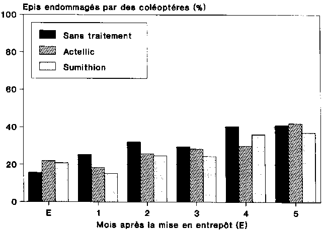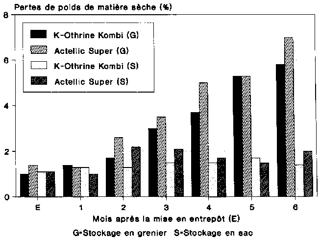 Pour en revenir aux essais effectués ici, l'insecticide K-Othrine Kombi, dont les composantes sont le pirimiphos-méthyl et la deltaméthrine, s'est montré plus efficace que l'insecticide Actellic Super, dont les substances actives sont le pirimiphos-méthyl et la perméthrine. KRALL (1988) arrive dans ses essais au même résultat. Au cours des essais en plein champ réalisés par GOLOB et HANKS (1990) en Tanzanie, et des expériences de laboratoire de SAMSON et PARKER (1989), la deltaméthrine s'est révélée plus efficace que la perméthrine contre les ravageurs des stocks.