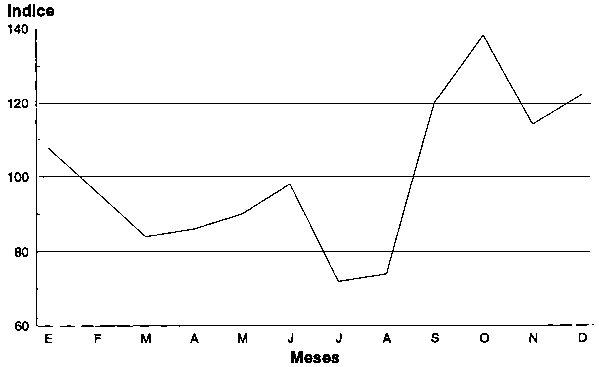 Un ejemplo de precios mensuales promedio de batatas (boniato) al por mayor en Santo Domingo, República Dominicana, durante un penado de 10 años se presenta en el Cuadro 4.5. Se calculan los promedios mensuales y sus coeficientes de variación para cada año. Un índice por temporada se calcula para cada mes del período de 10 años. Los índices por temporada trazados en forma gráfica suministran un precio al por mayor por temporada, tal como se muestra en la Figura 4.4. Esta figura indica aquellos meses en los cuales los precios son probablemente más bajos (máxima oferta) y aquellos meses cuando los precios son probablemente más altos (mínima oferta), basados en un promedio de precios de 10 años.