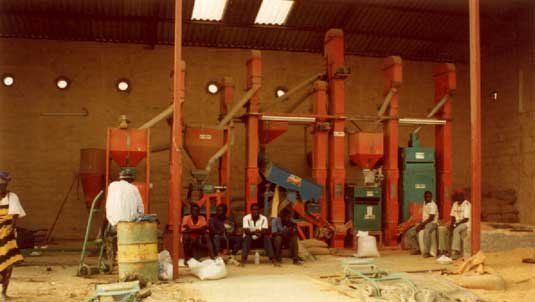 Rizerie de Diagambal, 2 tonnes/h, problèmes d'infrastructures de stockage et d'évacuation de la balle de riz. Vallée du Fleuve Sénégal, 1993.
