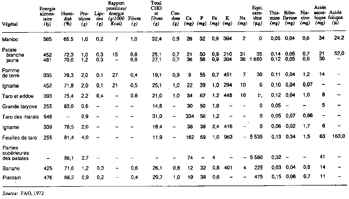 Tableau 4.4 Valeur nutritive des plantes-racines tropicales (pour 100 g de produit comestible)