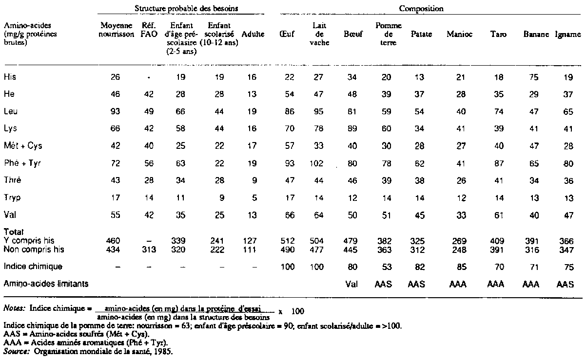 Cela souligne la nécessité de compléter les régimes à base d'igname par davantage d ' aliments riches en protéines afin d'assurer la croissance normale des nourrissons. Le taro frais contient beaucoup d'eau et représente un aliment à faible teneur énergétique par rapport à d'autres racines. Il a une teneur en protéines d'environ 2 pour cent (tableau 4.4) et un indice chimique de 70 (tableau 4.5). Toutefois, l'indice chimique seul n'est pas satisfaisant comme indice de la teneur et de l'efficacité protéique dans l'alimentation. Il vaut mieux recourir à des essais d'alimentation contrôlés pour obtenir des coefficients de digestibilité. Ces coefficients ont été déterminés pour de nombreux aliments. Si on manque de renseignements sur la digestibilité de la protéine dans un régime alimentaire particulier, on en déterminera le coefficient en utilisant des valeurs relatives à chaque composant et en faisant la moyenne pondérée selon le pourcentage de protéines fournies par ces aliments. Avec des aliments à faible teneur protéique comme l'igname ou le manioc, les essais d'alimentation visant à déterminer l'efficacité biologique de la protéine sont souvent peu concluants. Pour une rectification approximative dans le cas d'un régime à base de protéines végétales, on pourra appliquer un coefficient de digestibilité de 85 pour cent (OMS, 1985).