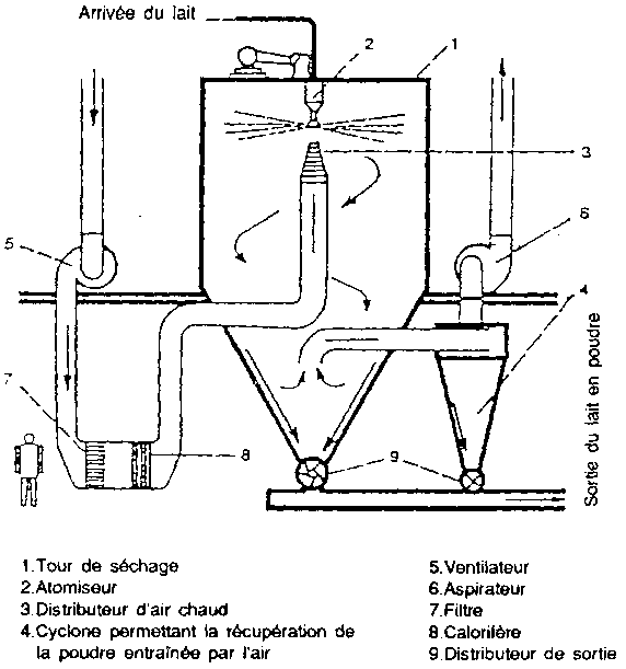 Le procédé par pulvérisation (procédé spray ou par atomisation) (figure 1 1 ) est le procédé le plus employé dont il existe diverses variantes. Le lait concentré est finement pulvérisé à l'aide d'une turbine dans un courant d'air chaud (vers 150 °C) à l'intérieur d'une tour de séchage. Le séchage se tait par entraînement, l'air chaud servant de vecteur de chaleur et d'humidité. L'évaporation de l'eau se fait par diffusion instantanée, ce qui provoque le refroidissement (vers 90 °C) de la poudre et de l'air.