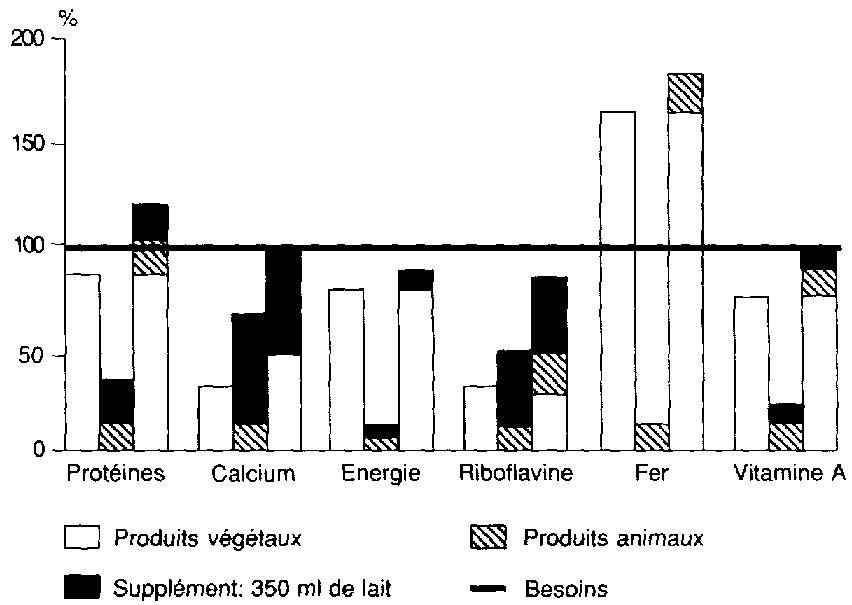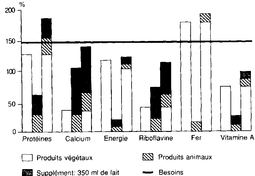 L'analyse des données chiffrées se rapportant aux régions d'Afrique, du Proche-Orient, d'Extrême-Orient et d'Amérique latine dévoile que l'apport lacté qui comblerait le déficit en calcium oscille de 250 à 400 ml. Une telle pratique permettrait de rehausser un apport protéique apparemment acceptable, mais essentiellement végétal, donc de fait assez médiocre.