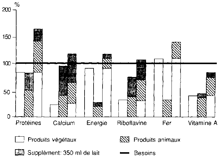 L'introduction d'une certaine quantité de lait améliorerait la couverture des besoins nutritionnels de la manière suivante. Dans les régions du monde où la disponibilité des produits laitiers est particulièrement faible et l'apport protéique animal généralement insuffisant, on observe que la consommation quotidienne d'un tiers de litre de lait de vache ajouté à l'alimentation habituelle apporterait des quantités appréciables de protéines, de calcium, de phosphore et même d'énergie, mais contribuerait pour une quantité négligeable aux besoins en vitamines, en oligo-éléments et en acides gras essentiels.