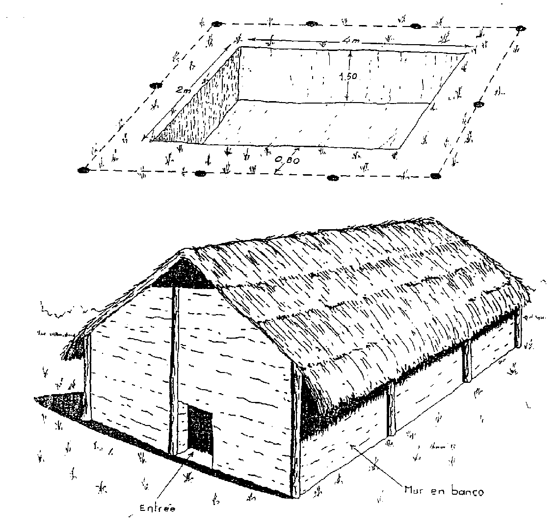 - La fosse-paillote, cave de 4m sur 2m sur 1,80m de profondeur (figure 2.3). Les murs en banco sont à 60cm des bords de la fosse, délimitant ainsi un espace de circulation. Des morceaux de bois formant un caillebotis disposé au fond de la fosse et recouvert de paille assurent un bon isolement des tubercules. Des allées aménagées entre les parois de la fosse et les ignames (0,30m) et entre les tas d'ignames (0,50m) facilitent la circulation de l'air et l'inspection du produit.