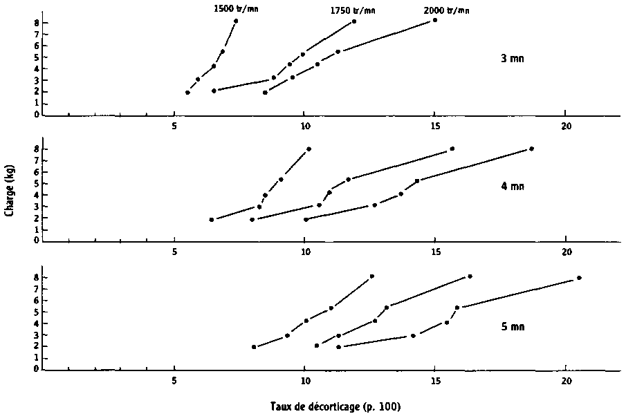 En faisant varier la vitesse de rotation des organes abrasifs, la quantité de grains dans la chambre et le temps de décorticage, on a obtenu les résultats ci-après (figs 1-4):