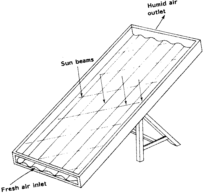 External air heater. A good air heater consists of an enclosure' rectangular in cross section. The ceiling of the enclosure is a transparent sheet allowing the sun rays to heat the black painted bottom.