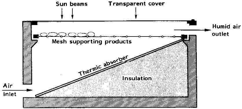 In all the countries visited, the mission did not hear of or see any case of indirect solar drying which would have given dried fruit and vegetables of first class quality. The few good quality products found on the market came from industrial drying plants using diesel oil for artificial heating.