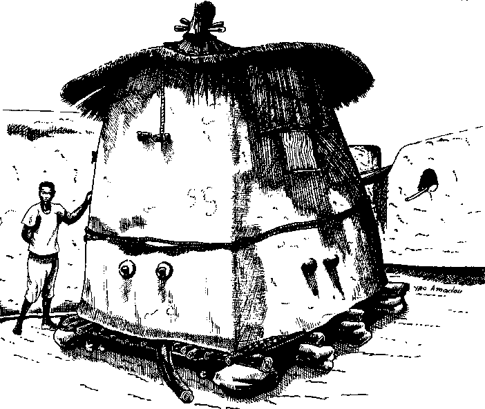 Figure F.3: Modification apportée sur le grenier traditionnel Bwaba par le projet PFL de San: forme cylindrique; grenier se terminant par un dôme recouvert d'un toit en paille; grenier sur dalle de béton installée sur 3 piliers; ouvertures à la base et au sommet.