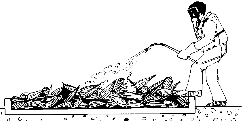 11. Hacer una pulverización residual con insecticida en todos los lados y en lo alto de la pila para prevenir una reinfestación del grano (figura 38).