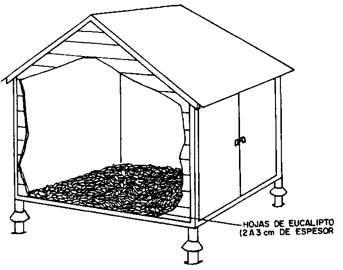 Edificios a prueba de roedores. En el caso de un depósito de madera, debe elevarse el piso de modo que quede como mínimo a unos 80 cm por encima del suelo. Alrededor de los pilares se deben colocar barreras contra ratones para impedir que trepen por ellos (figura 62). En un almacén tradicional es necesario cubrir las paredes externas con argamasa de cemento liso hasta unos 60 cm de altura, y procurar que las puertas y ventanas ajusten perfectamente (figura 63).