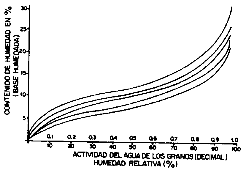 La afinidad entre los granos y el agua es comúnmente denominada higroscopicidad. El potencial de absorción de agua de las substancias que constituyen el grano puede ser representado gráficamente o en la forma de tablas, como las presentadas en el anexo. Una isoterma describe la cantidad de agua absorbida por un material biológico (contenido de humedad) a una cierta temperatura y humedad relativa que se mantienen constantes. La figura 4 muestra las isotermas del maíz para algunas temperaturas.