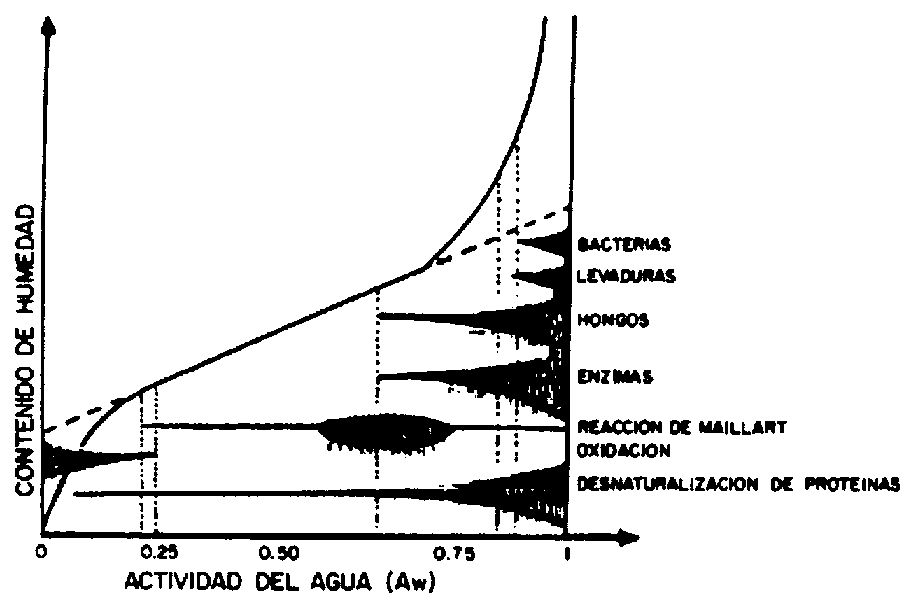 Las reacciones químicas y bioquímicas requieren un mínimo de "agua solvente" para poder comenzar, así su velocidad aumenta en función de la cantidad de "agua solvente" disponible. Como ejemplo se pueden citar las reacciones enzimáticas, las reacciones de maduración, hidrólisis de proteínas y la gelatinización de carbohidratos. En la figura 6 se muestra el deterioro que ocurre en los granos.