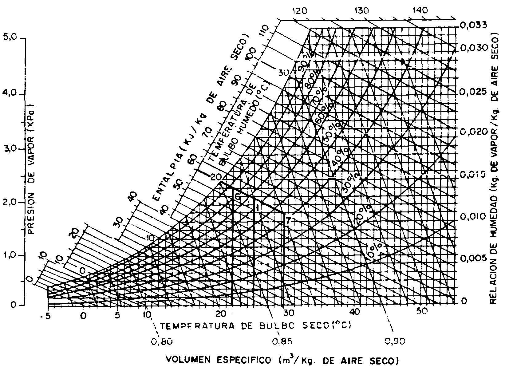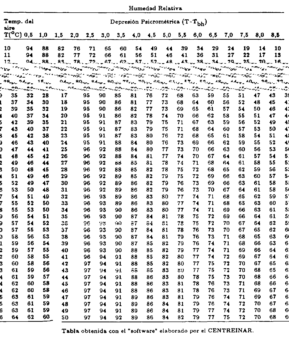 El cuadro 7 se emplea en la determinación de la humedad relativa del aire cuando se conocen las temperaturas del bulbo seco T y del bulbo húmedo Tbh. Dicha tabla se preparó para una presión atomosférica normal (nivel del mar). El cuadro es de doble entrada: la temperatura del termómetro de bulbo seco T se encuentra en la primera columna y la depresión psicrométrica (T-Tbh) en la primera línea. Los diversos valores de humedad relativa constituyen el cuerpo de la tabla. Así, por ejemplo, una temperatura del bulbo seco (T) de 28°C y una temperatura del bulbo húmedo (Tbh) de 25°C se encuentra en la primera columna de valor correspondiente a T = 28°C (cuadro 7). Siguiendo horizontalmente hasta la columna cuya depresión psicrométrica es 3°C, se encuentra el valor de Ø = 78 por ciento de humedad relativa del aire.