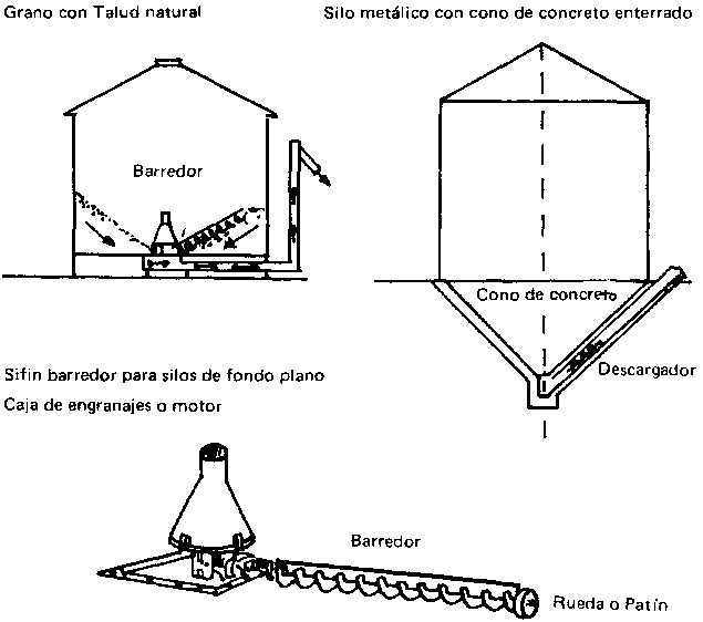La base de los silos puede ser plana o cónica para facilitar la salida del grano. El techo es cónico, por lo general con un ángulo de caída de 25°.