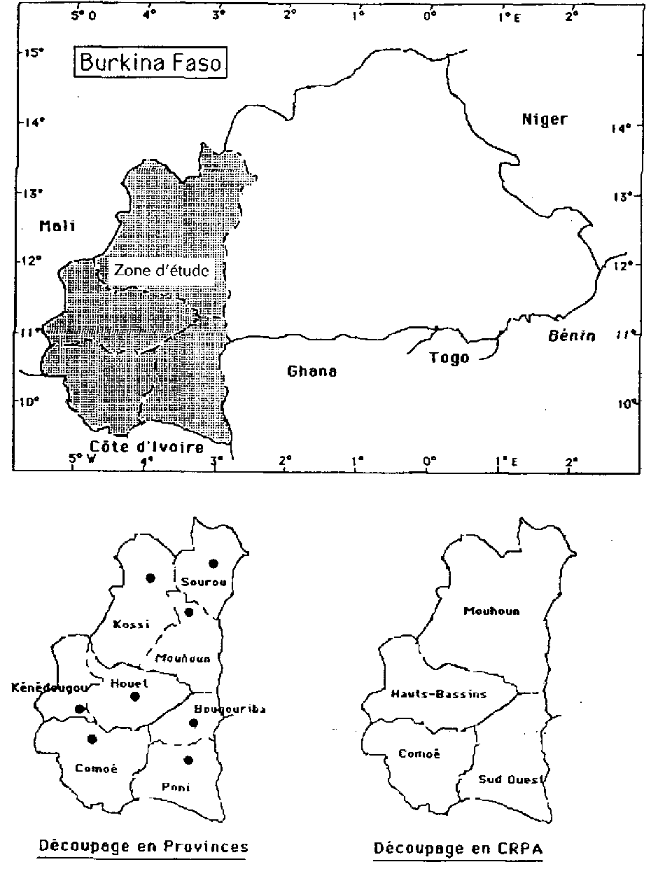 La zone d'étude correspond à la région ouest et sud-ouest du Burkina Faso. Elle fait frontière avec le Mali, la Côte-d'Ivoire et le Ghana.