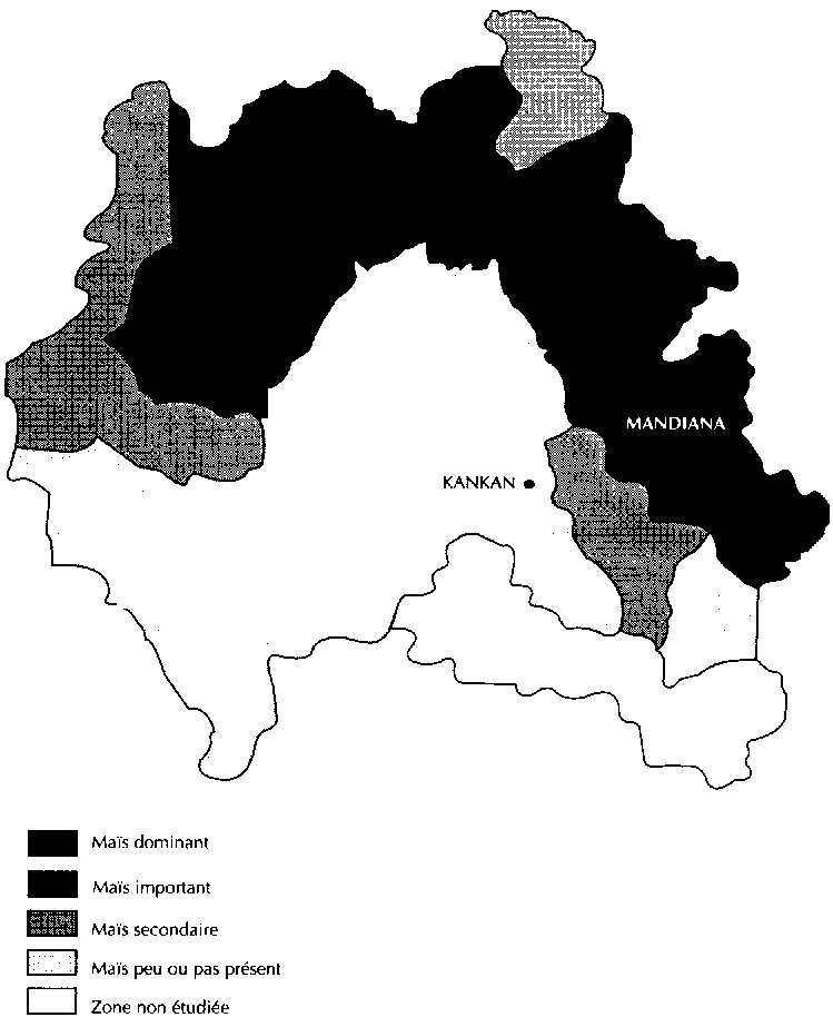 On distingue schématiquement trois grands systèmes de culture, dans lesquels la place du maïs varie: le «système de Mandiana», le «système de Siguiri» et le «système de Kankan» (figure 2).
