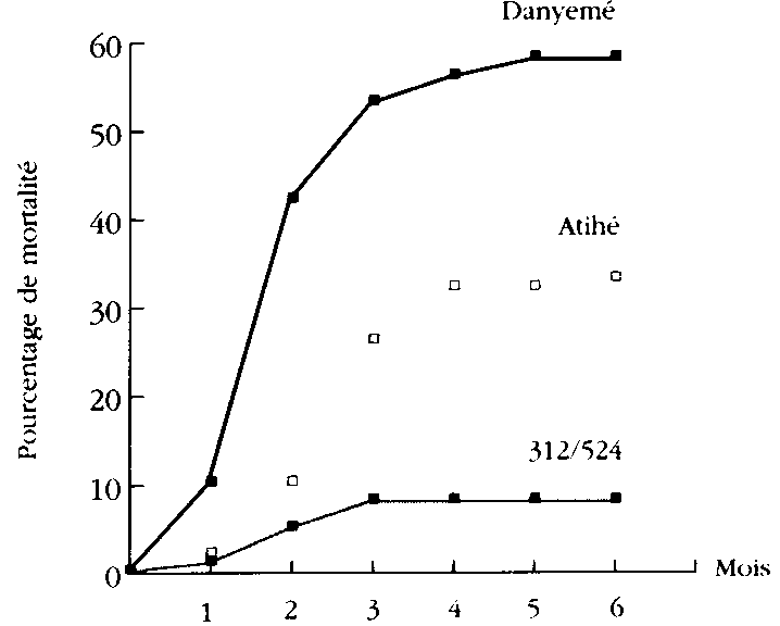 Les relevés de mortalité (Figure 2) ont confirmé l'extrême sensibilité à la maladie de la variété Danyémé et la résistance de certaines variétés améliorées introduites.