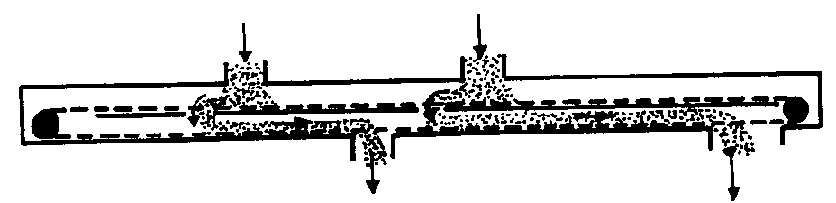 Une application particulière du transport pneumatique est le système «Pale Westerby» de vidange intégrale des cellules à fond plat à l'aide de gaines de ventilation très rapprochées (1 m environ). Ces gaines comportent des ouïes latérales d'où l'air sort à grande vitesse et entraîne le grain vers les orifices de vidange (Cf. fig. 142) à un débit décroissant de 40 t/h à 0 en fin de vidange. Dans cette application, les puissances installées sont importantes, mais le dispositif peut également être utilisé pour la ventilation du stock.