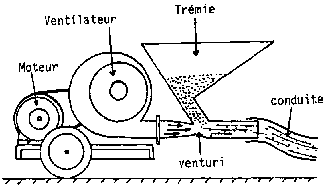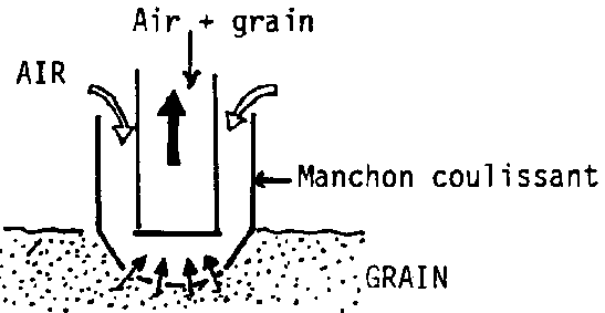 Lorsqu'ils travaillent en aspiration, les transporteurs sont dotés d'une suceuse que l'on plonge dans le produit. Le dosage du mélange air-produit est obtenu par le déplacement d'un manchon coulissant qui forme une double enveloppe et ouvre plus ou moins le passage de l'air (Cf. fig. 193).