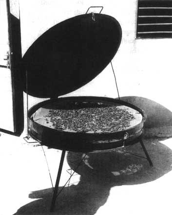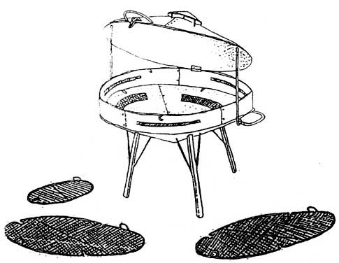 Description générale: il est composé de deux cônes métalliques reliés par une charnière. Il est conçu pour protéger les aliments des insectes et de la poussière. Diamètre: 70, 90 et 110 cm selon les modèles 1, 2 ou 3. Surface de séchage: 0,5; 1,4 ou 2,2 m².